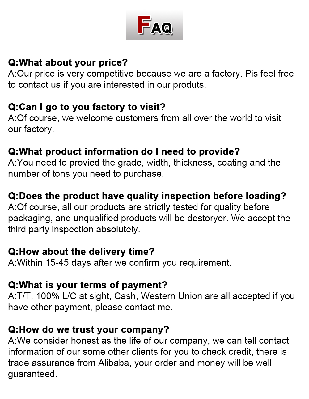 Поддерживая принцип 'Customer First ', компания предоставляет персонализированные услуги настройки. От дизайна продукта до производства и доставки, каждый шаг строго контролируется, чтобы обеспечить создание высококачественных продуктов, которые соответствуют конкретным требованиям глобальных клиентов. Благодаря отличному качеству продукции и хорошей бизнес -репутации, компания постоянно расширяла свой бизнес и завоевала широкое признание и доверие от клиентов дома и за рубежом. В будущем Haihong Steel будет продолжать продвигаться вперед, продвигать развитие посредством инноваций и вводить новую жизненную силу на мировой рынок металлических продуктов.